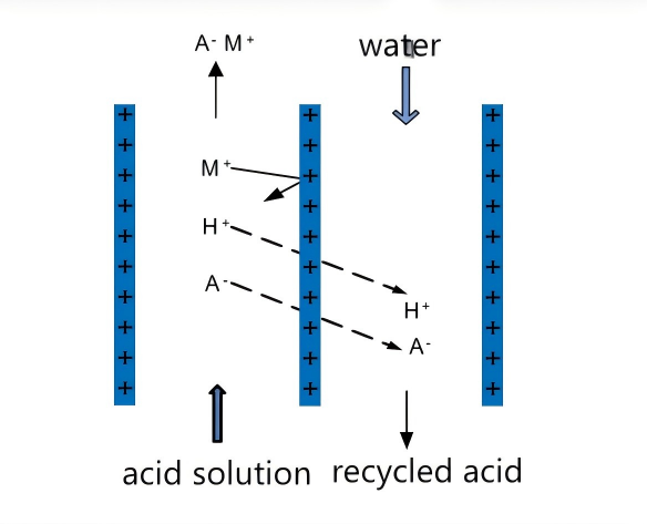The diffusion dialysis process takes concentration difference as the driving force, and uses the selective permeability of (anion) cation exchange membranes to (acid) alkali and high retention of salts or other components to separate (acid) alkali from salts or other components in the solution. The separated alkali (acid) solution is reused in the production process.